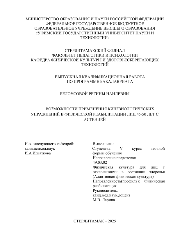 Белоусова, Регина Наилевна. Возможности применения кинезиологических упражнений в физической реабилитации лиц 45-50 лет с астенией [Электронный ресурс]: выпускная квалификационная работа бакалавра по направлению подготовки 49.03.02 Физическая культура для лиц с отклонениями в состоянии здоровья (Адаптивная физическая культура). Программа: Физическая реабилитация / Р. Н. Белоусова; Уфимский университет науки и технологий, Стерлитамакский филиал, Факультет педагогики и психологии, Кафедра физической культуры и здоровьесберегающих технологий, научный руководитель М. В. Ларина. — Стерлитамак, 2026. — 50 с. — <URL:https://elib.bashedu.ru/dl/diplom/SF/2026/FPIP/BelousovaRN_49_03_02_ZSAFK53_bak_2026_VKR.pdf>. — текст: электронный