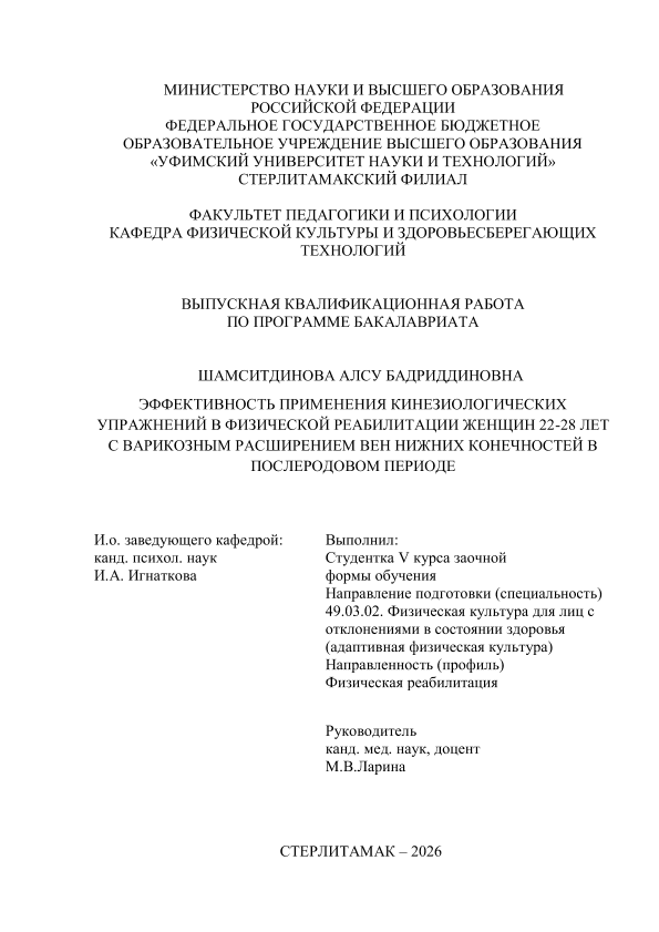 Шамситдинова, Алсу Бадриддиновна. Эффективность применения кинезиологические упражнения в физической реабилитации женщин 22-28 лет с варикозным расширением вен нижних конечностей в послеродовом периоде [Электронный ресурс]: выпускная квалификационная работа бакалавра по направлению подготовки 49.03.02 Физическая культура для лиц с отклонениями в состоянии здоровья (Адаптивная физическая культура). Программа: Физическая реабилитация / А. Б. Шамситдинова; Уфимский университет науки и технологий, Стерлитамакский филиал, Факультет педагогики и психологии, Кафедра физической культуры и здоровьесберегающих технологий, научный руководитель М. В. Ларина. — Стерлитамак, 2026. — 58 с. — <URL:https://elib.bashedu.ru/dl/diplom/SF/2026/FPIP/ShamsitdinovaAB_49_03_02_ZSAFK52_bak_2026_VKR.pdf>. — текст: электронный