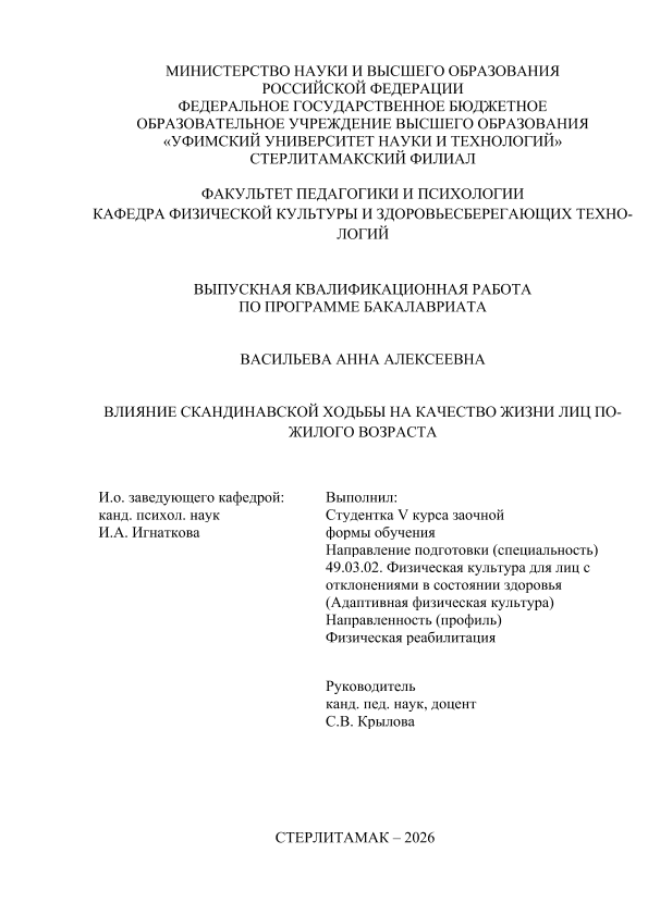 Васильева, Анна Алексеевна. Влияние скандинавской ходьбы на качество жизни лиц пожилого воз раста [Электронный ресурс]: выпускная квалификационная работа бакалавра по направлению подготовки 49.03.02 Физическая культура для лиц с отклонениями в состоянии здоровья (Адаптивная физическая культура). Программа: Физическая реабилитация / А. А. Васильева; Уфимский университет науки и технологий, Стерлитамакский филиал, Факультет педагогики и психологии, Кафедра физической культуры и здоровьесберегающих технологий, научный руководитель С. В. Крылова. — Стерлитамак, 2026. — 43 с. — <URL:https://elib.bashedu.ru/dl/diplom/SF/2026/FPIP/VasilevaAA_49_03_02_ZSAFK52_bak_2026_VKR.pdf>. — текст: электронный