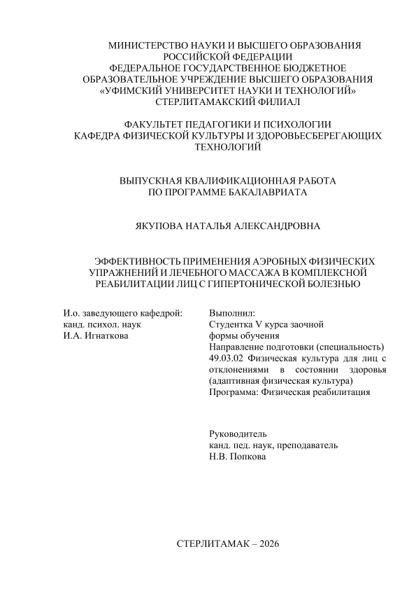 Якупова, Наталья Александровна. Эффективность применения аэробных физических упражнений и лечебного массажа в комплексной реабилитации лиц с гипертонической болезнью [Электронный ресурс]: выпускная квалификационная работа бакалавра по направлению подготовки 49.03.02 Физическая культура для лиц с отклонениями в состоянии здоровья (Адаптивная физическая культура). Программа: Физическая реабилитация / Н. А. Якупова; Уфимский университет науки и технологий, Стерлитамакский филиал, Факультет педагогики и психологии, Кафедра физической культуры и здоровьесберегающих технологий, научный руководитель Н. В. Попкова. — Стерлитамак, 2026. — 44 с. — <URL:https://elib.bashedu.ru/dl/diplom/SF/2026/FPIP/YakupovaNA_49_03_02_ZSAFK52_bak_2026_VKR.pdf>. — текст: электронный