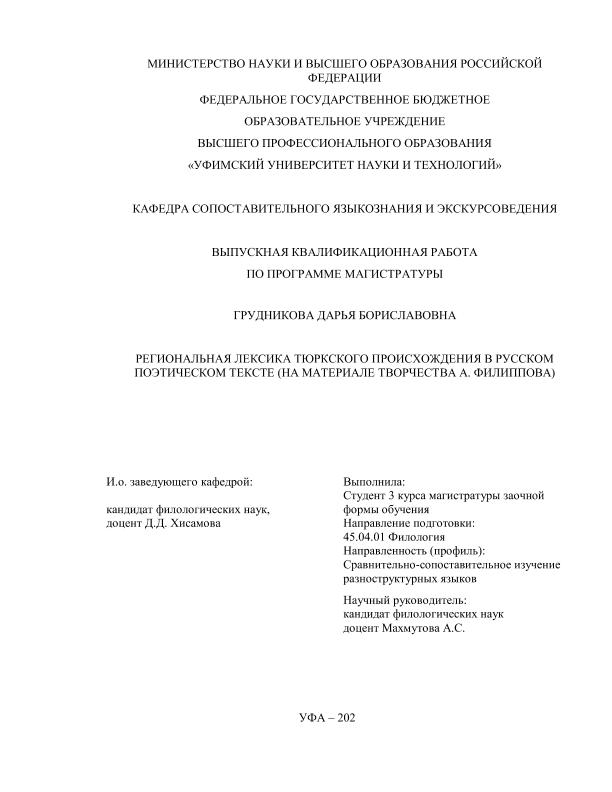 Грудникова, Дарья Бориславовна. Региональная лексика тюркского происхождения в русском поэтическом тексте (на материале творчества А. Филиппова): выпускная квалификационная работа по программе магистратуры. Направление подготовки (специальность) 45.04.01 "Филология". Направленность (профиль): "Сравнительно-сопоставительное изучение разноструктурных языков" / Д.Б. Грудникова; Уфимский университет науки и технологий, Факультет башкирской филологии, востоковедения и журналистики, Кафедра сопоставительного языкознания и экскурсоведения; научный руководитель А. С. Махмутова. — Уфа, 2026. — 110 с. — <URL:https://elib.bashedu.ru/dl/diplom/2026/Grudnikova_DB_IVT_45.04.01_Filologija_mag_2026.pdf>. — Текст: электронный