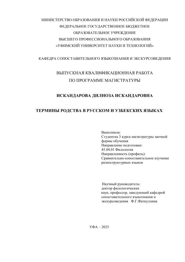 Искандарова, Дилноза Искандар Кизи. Термины родства в русском и узбекском языках: выпускная квалификационная работа по программе магистратуры. Направление подготовки (специальность) 45.04.01 "Филология". Направленность (профиль): "Сравнительно-сопоставительное изучение разноструктурных языков" / Д.И. Искандарова; Уфимский университет науки и технологий, Факультет башкирской филологии, востоковедения и журналистики, Кафедра сопоставительного языкознания и экскурсоведения; научный руководитель Ф. Г. Фаткуллина. — Уфа, 2025. — 89 с. — <URL:https://elib.bashedu.ru/dl/diplom/2026/Iskandarova_DI_IVT_45.04.01_Filologija_mag_2026.pdf>. — Текст: электронный