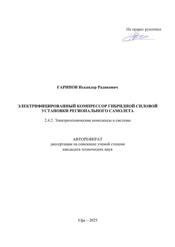 Гарипов, Искандер Радикович. Электрофицированный компрессор гибридной силовой установки регионального самолета: автореферат диссертации на соискание ученой степени кандидата технических наук: 2.4.2. Электротехнические комплексы и системы / И.Р. Гарипов; Уфимский университет науки и технологий; научный руководитель В.Е. Вавилов. — Уфа, 2025. — 25 с. — Защищена при УУНиТ. — Электрон. версия печ. публикации. — Доступ возможен через Электронную библиотеку УУНИТ. — <URL:https://elib.bashedu.ru/dl/corp/GaripovIR_Elektrofic.komressor gibrid.silov.ustan.regional.samoleta_avt_2025.pdf>. — Текст: электронный